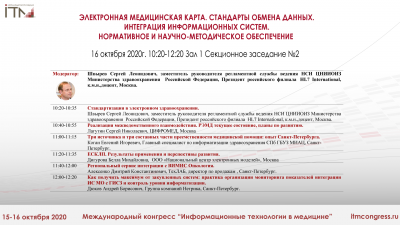 #ИТМ2020 16 октября 10:20 (мск.) ЭЛЕКТРОННАЯ МЕДИЦИНСКАЯ КАРТА. СТАНДАРТЫ ОБМЕНА ДАННЫХ. ИНТЕГРАЦИЯ ИНФОРМАЦИОННЫХ СИСТЕМ. НОРМАТИВНОЕ И НАУЧНО-МЕТОДИЧЕСКОЕ ОБЕСПЕЧЕНИЕ.