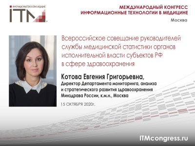 Всероссийское совещание руководителей службы медицинской статистики органов исполнительной власти субъектов Российской Федерации в сфере здравоохранения пройдет 15 октября 2020 года в рамках международного конгресса "Информационные технологии в медицине", #ИТМ2020.Проводить совещание будут: Котова Евгения Григорьевна, Директор Департамента мониторинга, анализа и стратегического развития здравоохранения Министерства здравоохранения Российской Федерации и