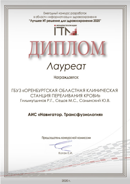 АИС «Навигатор. Трансфузиология» (ГБУЗ «Оренбургская областная клиническая станция переливания крови») - Лауреат ежегодного конкурса Конкурса "Лучшее ИТ решение для здравоохранения 2020"