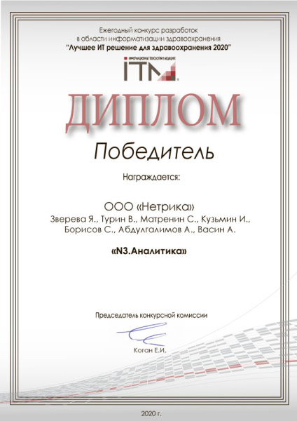 «N3.Аналитика» (ООО «Нетрика» https://netrika.ru/ ) - Победитель ежегодного конкурса Конкурса "Лучшее ИТ решение для здравоохранения 2020"