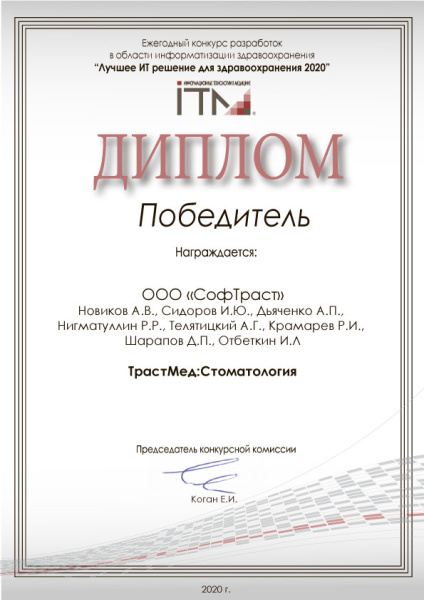 ТрастМед:Стоматология (ООО «СофТраст» https://softrust.ru/) - Победитель ежегодного конкурса Конкурса "Лучшее ИТ решение для здравоохранения 2020"