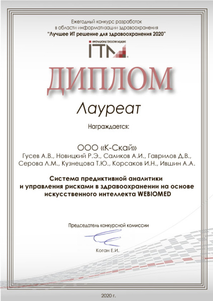 Система предиктивной аналитики и управления рисками в здравоохранении на основе искусственного интеллекта WEBIOMED https://webiomed.ai/ (ООО «К-Скай»). - Лауреат ежегодного конкурса Конкурса "Лучшее ИТ решение для здравоохранения 2020"