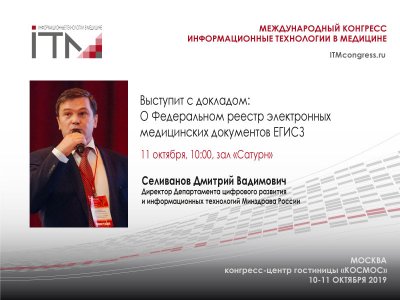 Директор Департамента цифрового развития и информационных технологий Министерства здравоохранения Российской Федерации Дмитрий Вадимович Селиванов выступит с докладом: Федеральный реестр электронных медицинских документов ЕГИСЗ. Доклад запланирован в рамках секции: "Электронная медицинская карта. Стандарты обмена данных. Интеграция информационных систем. Нормативное и научно-методическое обеспечение." , которая пройдет 11 октября с 10:00 в зале "Сатурн". Секция является программным мероприятием Международного конгресса "Информационные технологии в медицине", #ИТМ2019