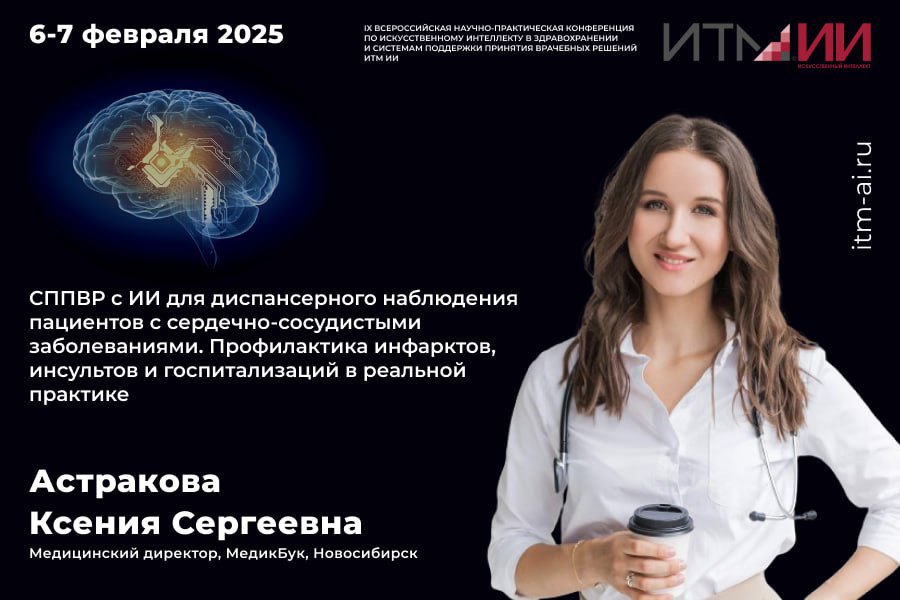 В секции «ИИ и СППВР в кардиологии», которая пройдет в первый день конференции ИТМ ИИ, будет представлена «СППВР с ИИ для диспансерного наблюдения пациентов с сердечно-сосудистыми заболеваниями». Медицинский директор «МедикБук» (Новосибирск) Ксения Сергеевна Астракова расскажет о профилактике инфарктов, инсультов и госпитализаций в реальной практике благодаря данному сервису.