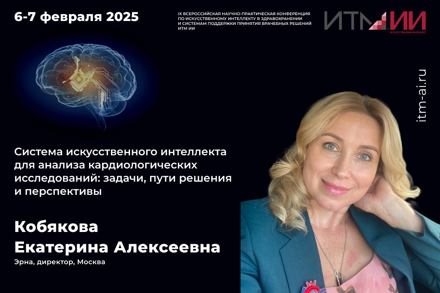6 февраля на площадке ИТМ ИИ пройдет круглый стол по теме «Внедрение искусственного интеллекта и СППВР в систему оказания медицинской помощи субъектов Российской Федерации по направлениям медицинской помощи. Практические аспекты. Технологии. Эффективность. Ч.1» (зал «Этажи», начало 13:00). О системе искусственного интеллекта для анализа кардиологических исследований расскажет директор компании «Эрна» (Москва) Екатерина Алексеевна Кобякова.