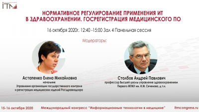 #ИТМ2020 16 октября 12:40НОРМАТИВНОЕ РЕГУЛИРОВАНИЕ ПРИМЕНЕНИЯ ИТ В ЗДРАВООХРАНЕНИИ. ГОСРЕГИСТРАЦИЯ МЕДИЦИНСКОГО ПО. .