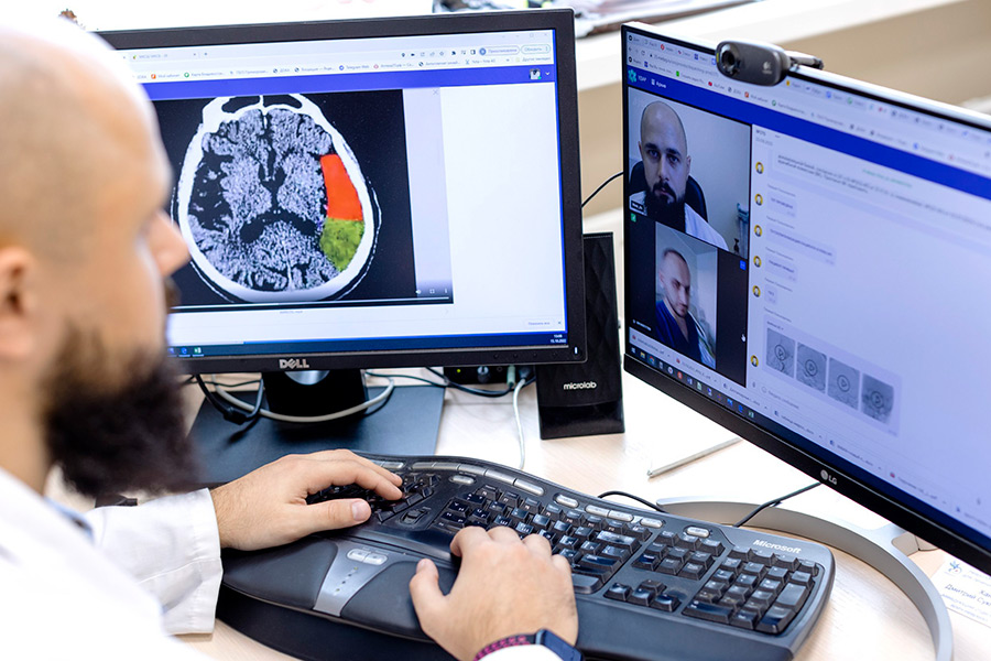 «КТ головного мозга» является частью комплексного решения для помощи пациентам с подозрением на инсульт «УДАР». Оно обеспечивает непрерывное сопровождение и максимально быструю маршрутизацию пациента с инсультом от момента вызова скорой медицинской помощи до проведения необходимого лечения. Синергетический эффект достигается благодаря работе круглосуточной дежурной службы, состоящей из врачей-неврологов регионального сосудистого центра, использованию телемедицины в формате «врач-врач» и технологий искусственного интеллекта.