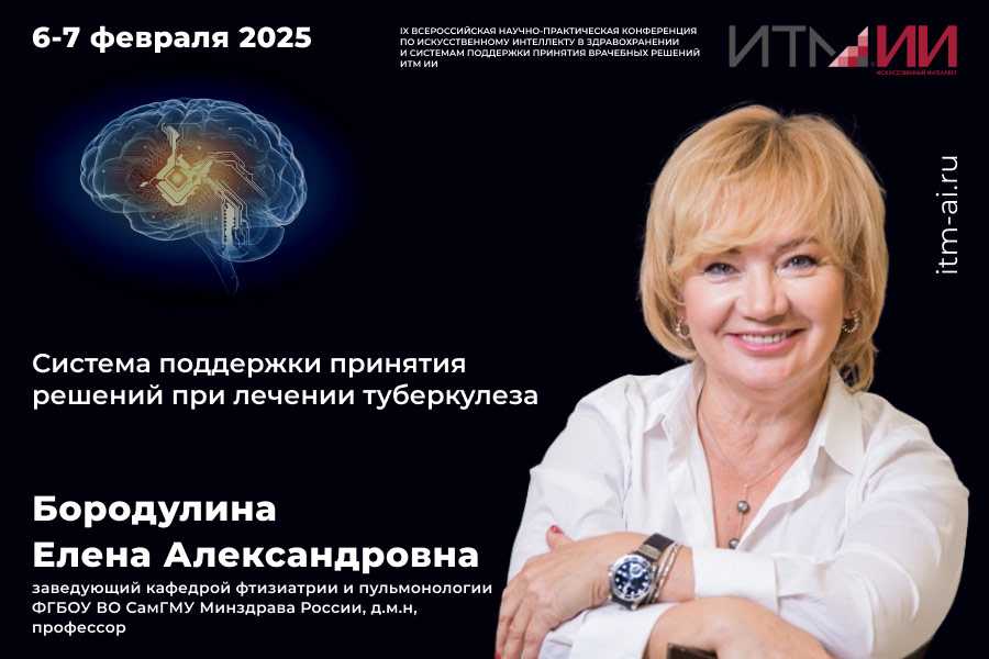 7 февраля, во второй день конференции ИТМ ИИ состоится пленарное заседание «Применение сервисов на основе технологий искусственного интеллекта в медицинской практике». О том, как использовать систему поддержки принятия решений при лечении туберкулеза, расскажет заведующая кафедрой фтизиатрии и пульмонологии ФГБОУ ВО СамГМУ Минздрава России, д.м.н, профессор Елена Александровна Бородулина.