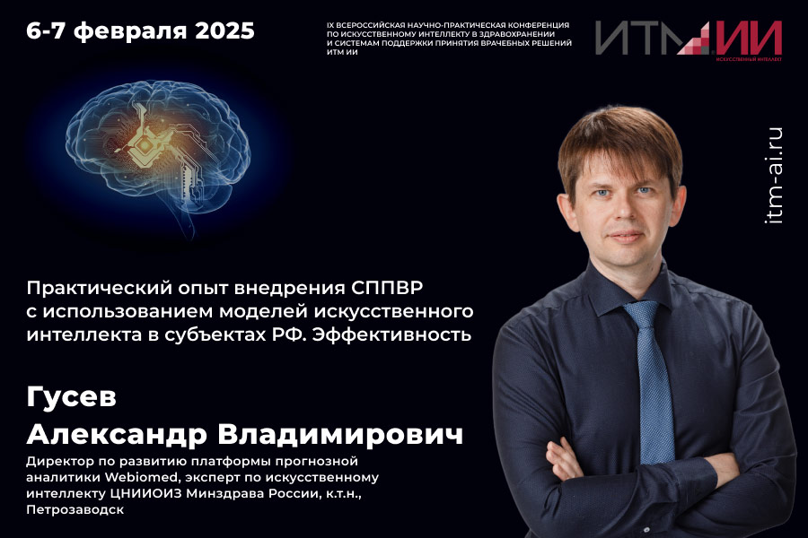 6 февраля на площадке ИТМ ИИ пройдет тематический круглый стол, на котором выступит директор по развитию платформы прогнозной аналитики Webiomed, эксперт по искусственному интеллекту ЦНИИОИЗ Минздрава России Александр Владимирович Гусев. Он представит доклад «Практический опыт внедрения СППВР для анализа ЭМК на основе искусственного интеллекта в субъектах РФ. Эффективность».
