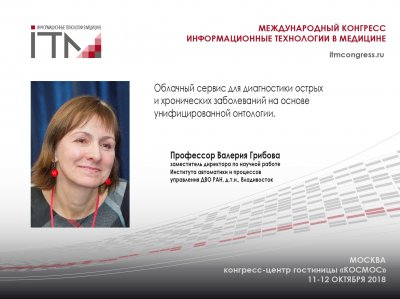 Профессор Валерия Грибова, заместитель директора по научной работе Института автоматики и процессов управления ДВО РАН, д.т.н., представит 12 октября на #ИТМ2018 свой доклад:"Облачный сервис для диагностики острых и хронических заболеваний на основе унифицированной онтологии."