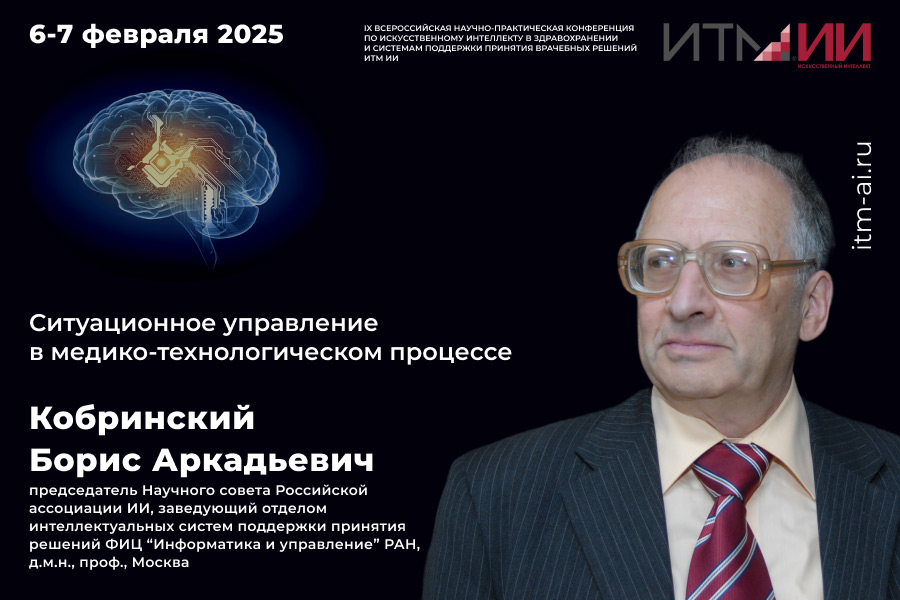 7 февраля, во второй день ИТМ ИИ состоится пленарное заседание «Применение сервисов на основе технологий искусственного интеллекта в медицинской практике». Модератор — председатель Научного совета Российской ассоциации искусственного интеллекта, заведующий отделом интеллектуальных систем поддержки принятия решений ФИЦ «Информатика и управление» РАН, д.м.н., профессор Борис Аркадьевич Кобринский. Он выступит с докладом «Ситуационное управление в медико-технологическом процессе».