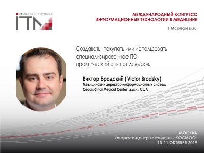 Виктор Бродский (Victor Brodsky) - медицинский директор информационных систем Cedars-Sinai Medical Center, д.м.н.- одного из крупнейших и современных госпиталей США. В рамках международного конгресса "Информационные технологии в медицине" 10-11 октября в Москве он расскажет о подходах и деталях создания ИТ систем сложных объектов в здравоохранении, поделится опытом их проектирования, внедрения и эксплуатации.Подробнее о международном конгрессе #ИТМ2019 https://itmcongress.ru