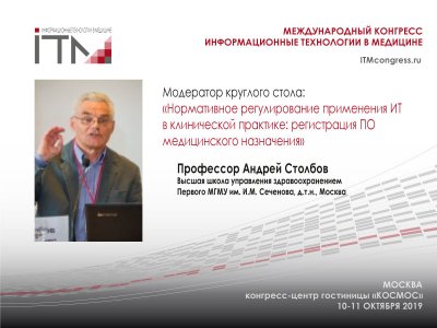 К участию в работе круглого стола планируется привлечь представителей разработчиков, регулятора, ведущих экспертов и крупнейших пользователей медицинских информационных систем. Программа круглого стола будет построена на базе решений, принятых в августе - сентябре по законопроекту, подготовленному в рамках АНО "Цифровая экономика" Подробнее о международном конгрессе #ИТМ2019 https://itmcongress.ru