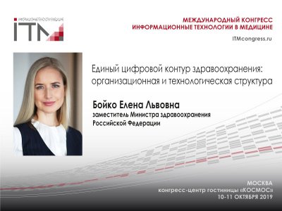 Заместитель министра здравоохранения Российской Федерации Елена Львовна Бойко выступит с установочным докладом на открытии ХХ-го Международного конгресса "Информационные технологии в медицине" 10 октября 2019 в Москве.Конгресс - крупнейшее ежегодное мероприятие в области цифрового здравоохранения в России, а также на территории Восточной Европы и Средней Азии, проводится ежегодно, 20-й год подряд.